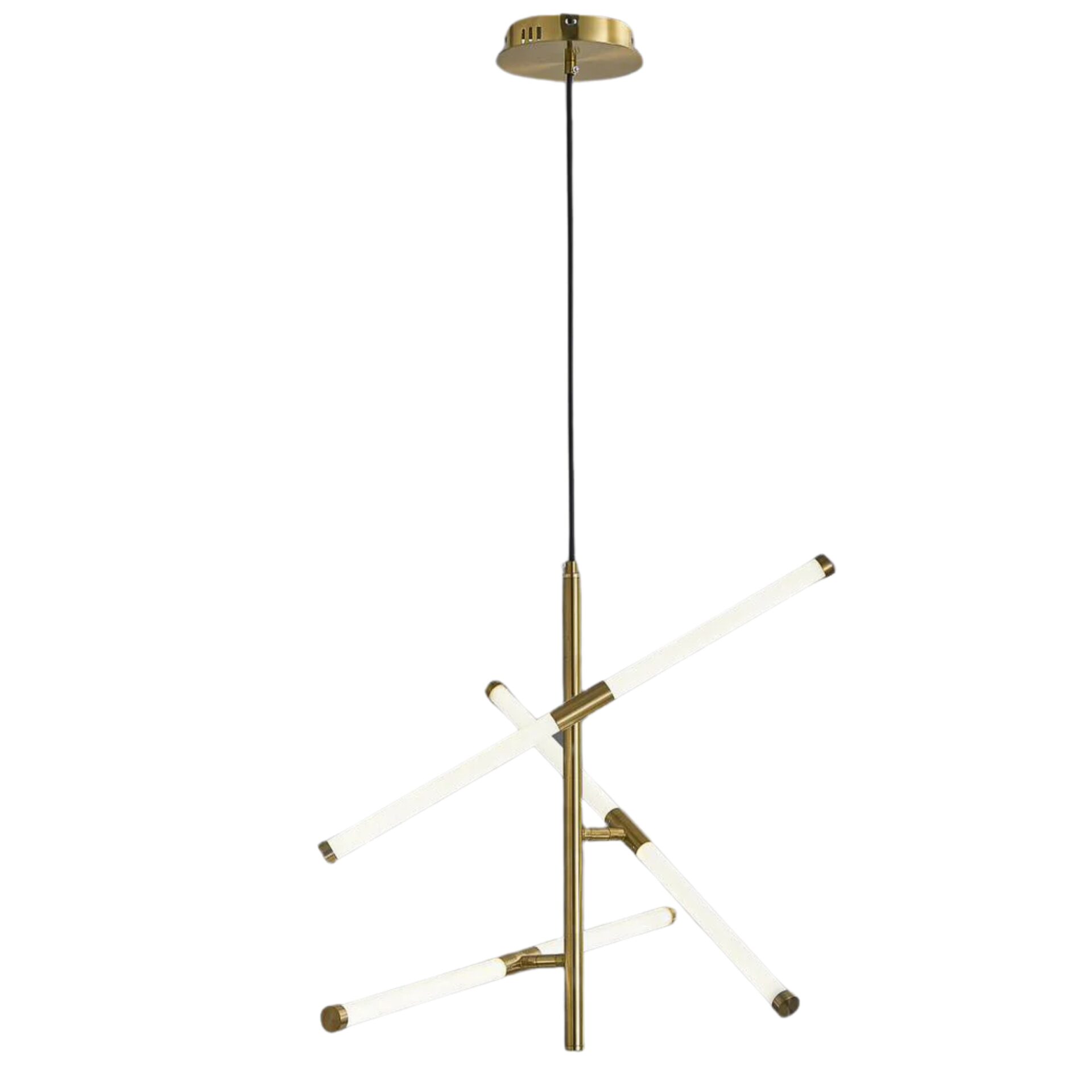 Su estructura en acabado dorado con barras cruzadas de luz crea una pieza visualmente impactante y perfectamente equilibrada entre modernidad y elegancia. Ideal para salas, comedores, oficinas o espacios comerciales que buscan destacar con estilo.